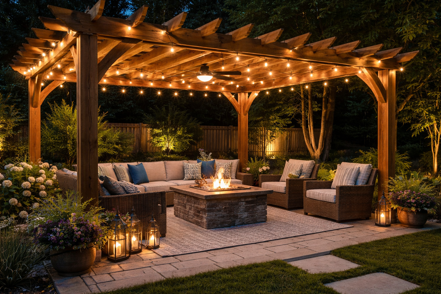 This approach adds visual interest, creates layers of light and shadow, and allows you to enjoy the full beauty of your outdoor space long after sunset.